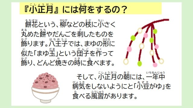 小正月のときには、1年間病気をしないようにと「あずきがゆ」を食べる風習があるそうです。