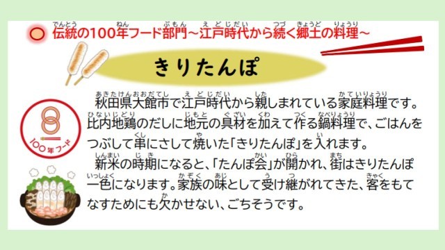 今月は秋田県の100年フード「きりたんぽ」をいただきます。