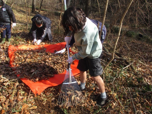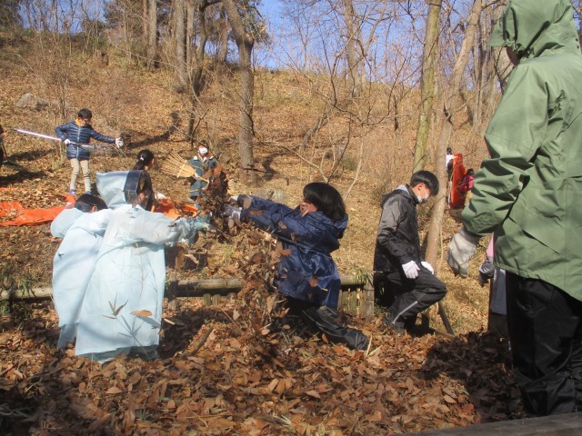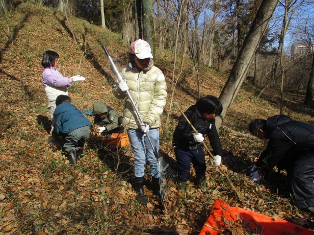 今日は長池公園で落ち葉かきをしました。落ち葉かきの意義や目的を教えていただき、グループで協力しながらたくさん集めたり、落ち葉のプールをかき混ぜたりと元気に活動していました。
