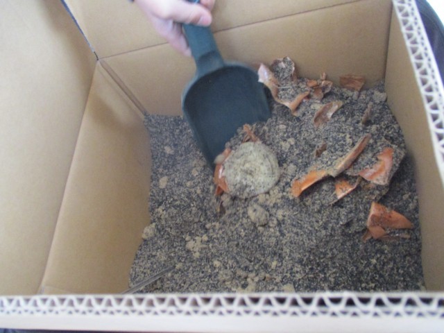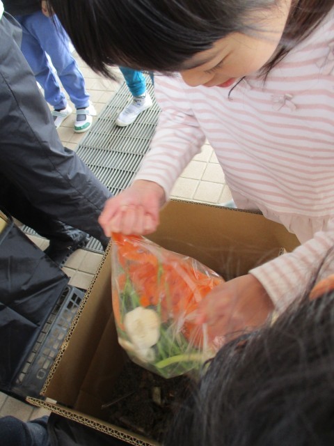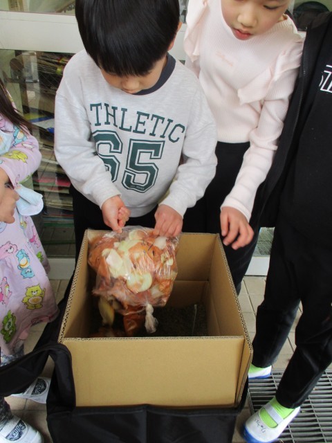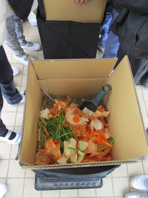 段ボールコンポストに給食から出た生ごみを・・!