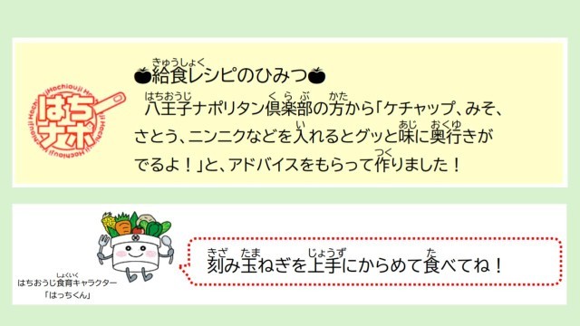 給食では、コッペパンにハチナポをはさみセルフサンドにしていただきます。