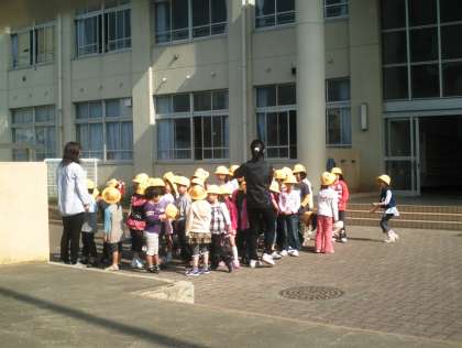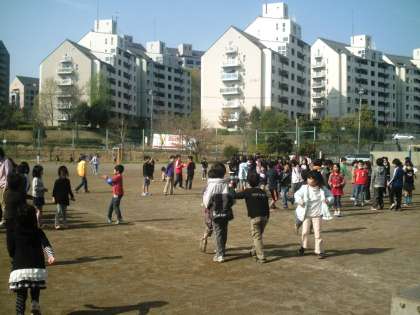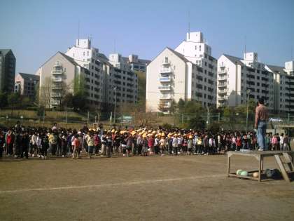 4月19日、気持ちのよい朝です。かばんを教室に置いて、子どもたちが続々と校庭に出てきます。今日は全校朝会があり、今週から1年生も参加します。