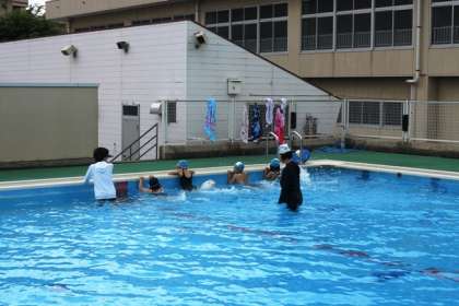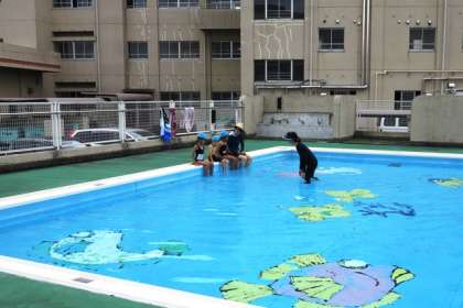 おおぞら学級の1・2組がプール開きをしました。風が強かったので、シャワーは特に冷たく感じたようです。