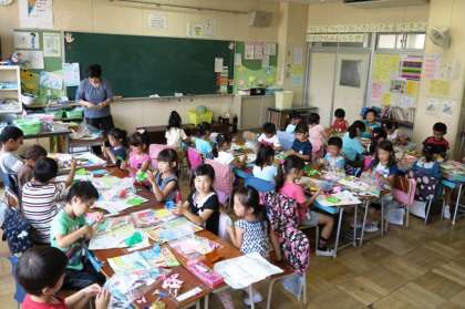 1年生が図画工作の学習で、いろいろな飾りを作りました。紙を折って、切込みを入れる。そして、紙を開いてできる形や模様を見て、子供たちは楽しんでいました。