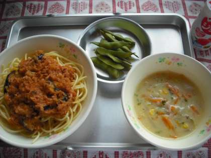 ☆★☆ ミートスパゲティーはやはり人気で、茄子もたくさん食べてくれていました(今日のナスは八王子産です) ☆★☆