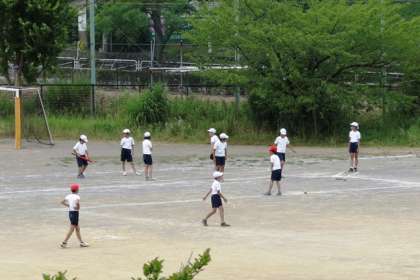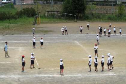 5年生が学年で、ベースボール型の球技と全員リレーをしました。写真は、ベースボール型の球技を楽しんでいるところです。