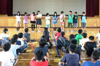 6年生が日光移動教室に出発するまで、あと数日となりました。今日は、学年全体が体育館に集合し、係ごとに仕事の内容なお願い等の発表をしました。写真は、室長さんたちが説明しているところです。