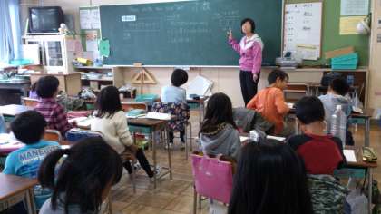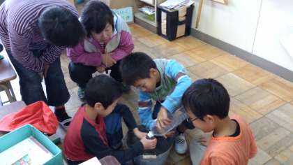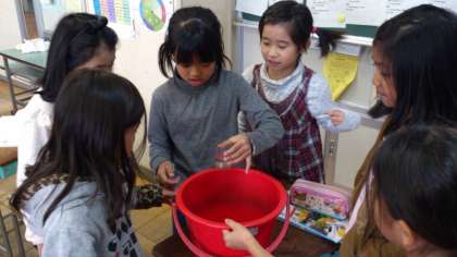 3年生の算数の学習です。水のかさを比べるには?という課題から、各グループでそれぞれ考えた入れ物に移し変えて、測っています。余りの部分をどうするか。体験活動を通して小数の学習に入ります。