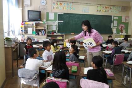 2年生が算数で九九の学習をしています。確実に覚えるために、いろいろな工夫をしながら指導しているところです。カードの九九の答えを一人一人に言わせています。
