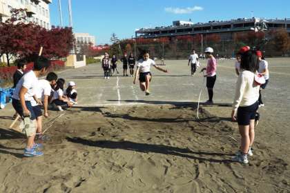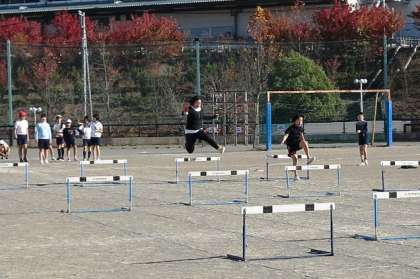6年生が体育で、走り幅跳びとハードル走の学習をしています。練習を重ねるうちに、フォームがよくなってきました。それに伴って記録もよくなっていることでしょう。