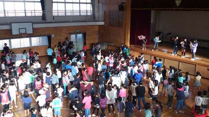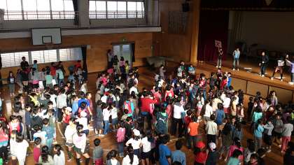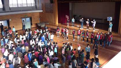 今朝は、集会委員会による○×クイズをしています。集会委員会の子供たちは、この日のためにクイズを考え、学校にある扇風機や食べられる実がなる植物の数などを調べて準備をしてきました。なかなか難しい問題で、盛り上がりました。