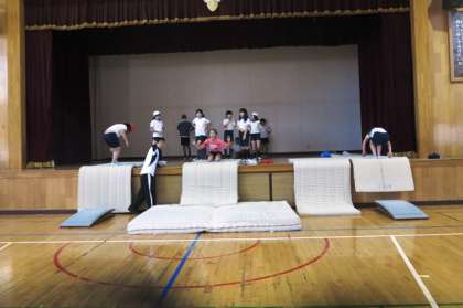 6年生が体育で跳び箱運動をしています。安全を第一に、スモールステップで学習できるように、様々な場を工夫しています。