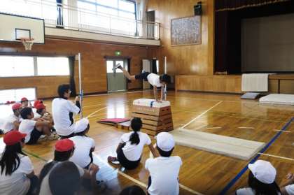 ステージも活用しています。下の写真は、大きな開脚跳びをしているところです