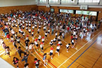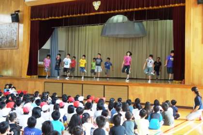 今日の集会は、体育集会でした。体育委員会の児童が見本を見せ、踊り方を教えてから、全校でジンギスカンを踊りました。短時間でしたが、よい運動になりました。