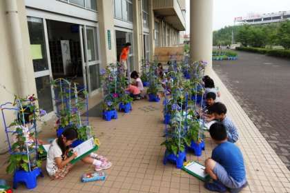 あさがおがきれいな花を咲かせ始めました。1年生はうれしいことでしょう。