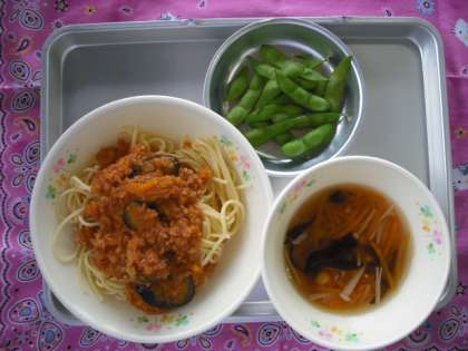 茄子ミートスパゲティー/きのことベーコンのスープ