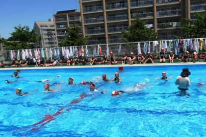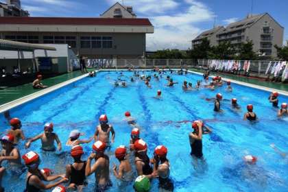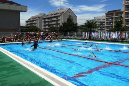 プールサイドの温度が高く熱中症が心配なので、途中で見学者も泳いでいる子供も、水分を補給する機会を設けました。