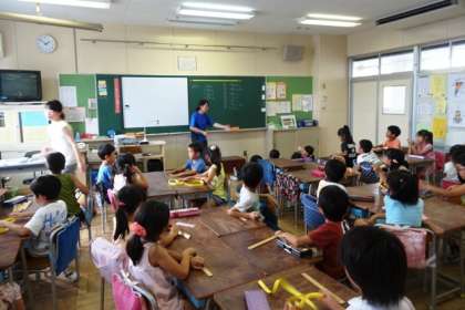 2年生が算数で長さについて学習しています。2年生の算数は、ティームティーチング(複数の教員)で指導する時間もあります。物差しを使って測定する場面では、特に効果的です。