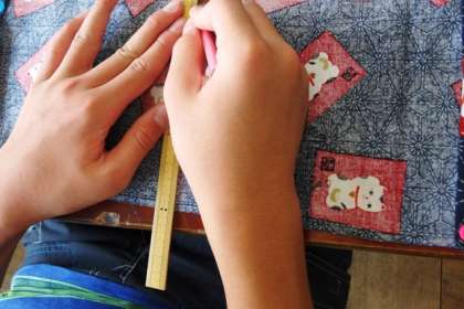6年生が家庭科でポケットティッシュカバーを作っています。細かく難しい作業ですが、粘り強く頑張っていました。