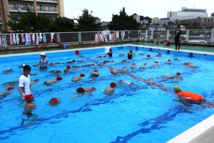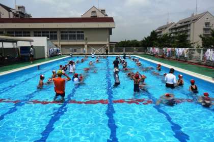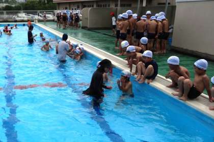 はじめに1・2年生合同の指導で歩いたり、水中ジャンケンをしたりするなどの水慣れをし、その後は、それぞれの学年に分かれて、検定を行いました。