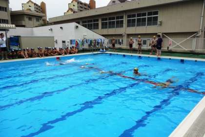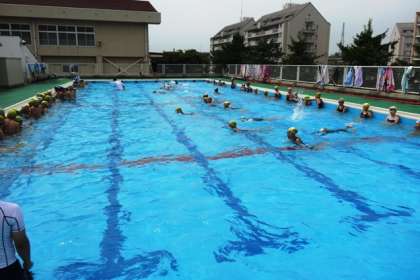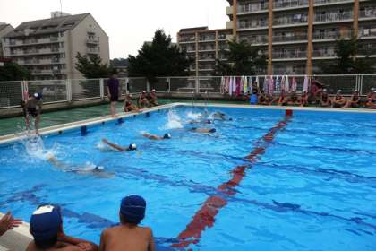 プールの横と縦で泳ぐ練習をしてから、検定をしました。多くの子供が自分が目指す級に合格しました。夏休みのプールでも練習を重ねてほしいと思っています。