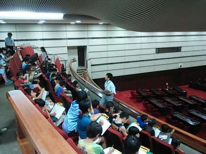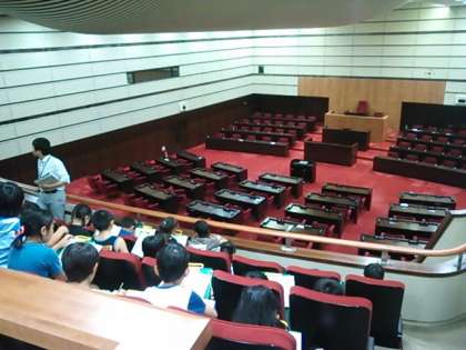 傍聴席で説明を聞いています。子供たちは積極的に質問しています。普段は撮影禁止とのこと。