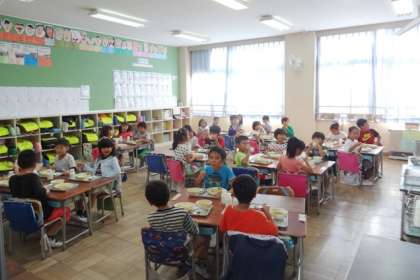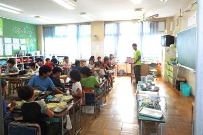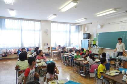 台風が通過した後は、青空が広がりました。登校時間を変更し、今日は給食の時間から始まりです。