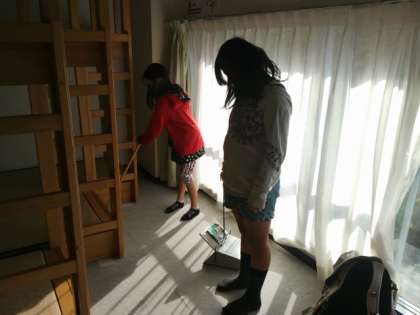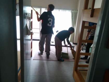 部屋の掃除をみんなで協力して行っています。これから、施設の方が部屋の点検に来ることになっています。
