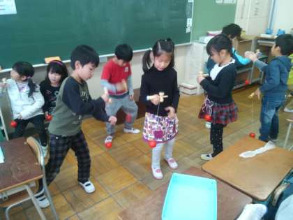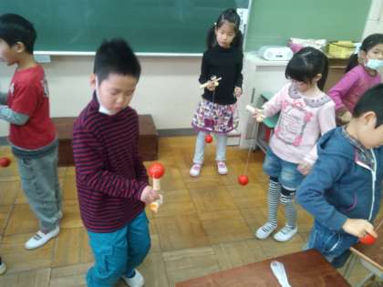 「昔あそびをしよう」ではけん玉に取り組んでいます。夢中になって練習している子供たち。技が上達しています。