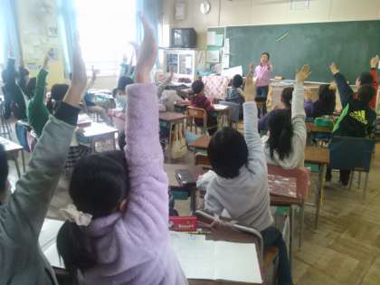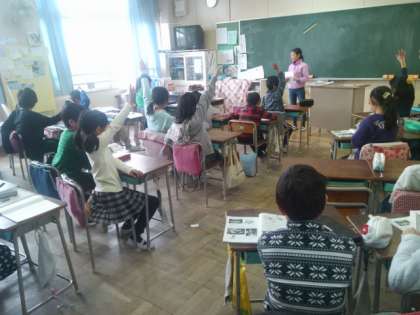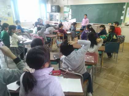 都道府県クイズを行っている場面です。調べたことをクイズで発表し、みんな夢中になって答えました。