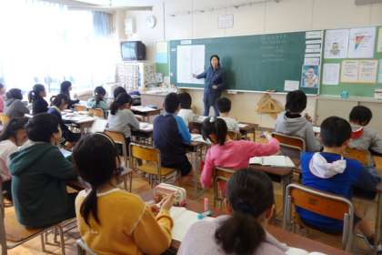 4年生が算数で、直方体の見取り図のかき方について復習しています。子供の意欲を引き出しながら指導しています。