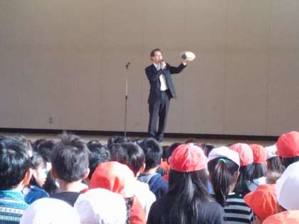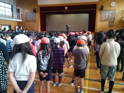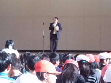 校長先生のお話です。ラグビーのスポーツを例に「一人はみんなのためにみんなは一人のために」ということの大切さについてのお話がありました。残りの1ヶ月、そのような気持ちを持って、いい学級を築いていってほしいという内容でした。