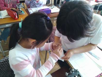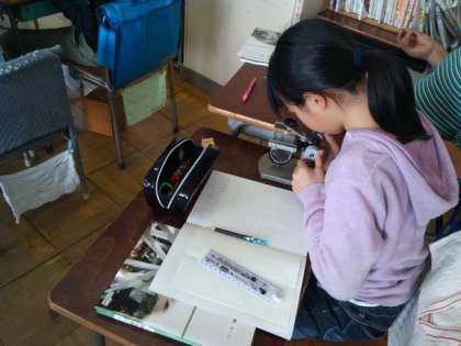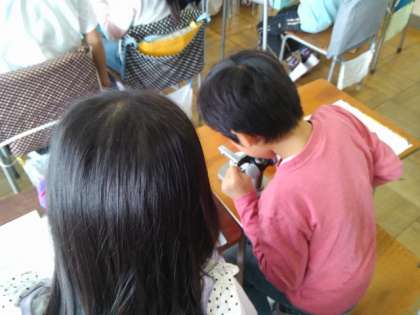 いんげん豆の種子の中の様子を、解剖顕微鏡を使って観察しました。種の中には芽のもとになるものがあることを確かめることができました。