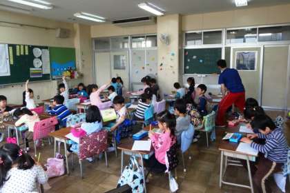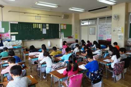 1年生が国語でひらがなの学習をしています。今日は「う」でした。唱え書き、空がき、言葉集めなど、一文字ずつ丁寧に指導していきます。