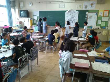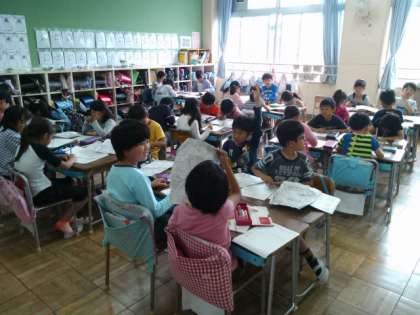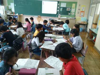 町たんけんで調べてきたことを、地図にまとめる学習を進めています。班で協力して話し合い、内容を考えています。