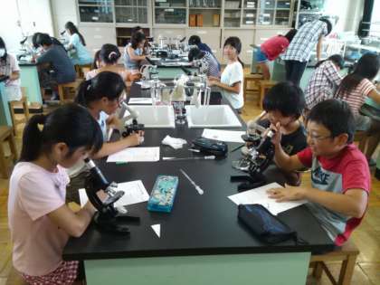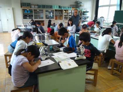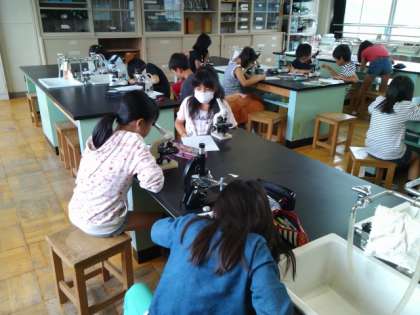 「水中の中の小さな生き物を調べよう」では、今回は「アオミドロ」を顕微鏡で観察しました。子供たちは顕微鏡の扱いにも慣れ、上手にスケッチをしていました。