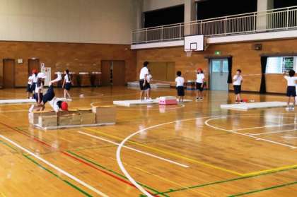 4年生が体育で側転の練習をしました。様々な場を設定しています。子供たちは自分に合った場で練習を重ねています。