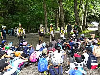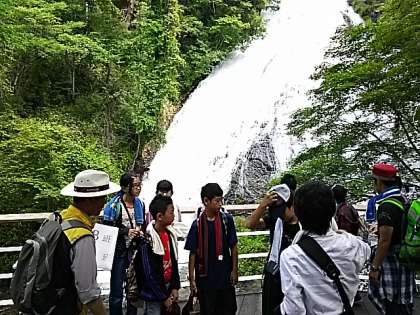 ネイチャーガイドさんとあいさつ。まずは、湯滝で記念撮影。