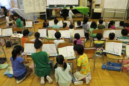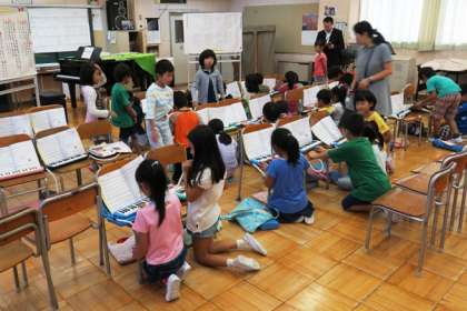 2年生が鍵盤ハーモニカで「あえてよかった」の練習をしています。できるようになった子供は、友達に教える活動を取り入れています。みんなが上手にできるようになることを目指しています。