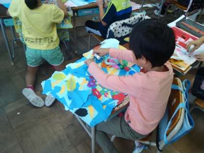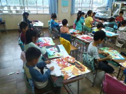 「ちぎった絵から生まれたよ」の作品が完成してきました。それぞれに想像力を働かせてちぎった絵から、作品が出来上がりました。
