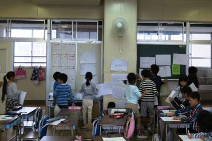 2枚目の写真は、画用紙に書いてある友達の考えを見ているところです。同じ数ずつ並べるとわかりやすくなることに気づいたでしょうか。これから、いよいよ子供たちが待ちに待った学習が始まります。