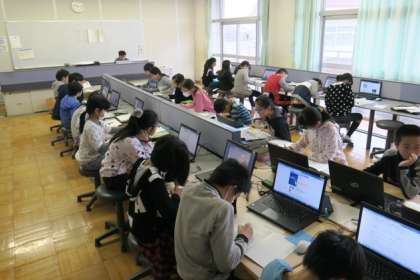 5年生が社会科の発展的な学習として、公害について調べ、考えたことを新聞にまとめていきます。今日は、パソコン室で資料を収集しながら学習を進めました。