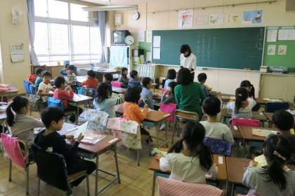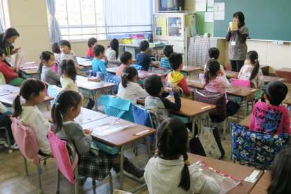 1年生の朝の様子です。担任が配布物(その列の人数分)を一番前の子供に渡します。子供は1枚自分の分をとり、残りを後ろの友達に渡しますが、ようやくスムーズにできるようになってきました。こういったことも一つ一つ学んでいくのが1年生です。