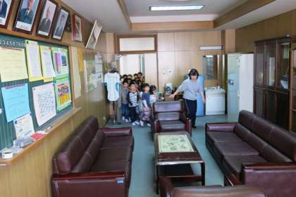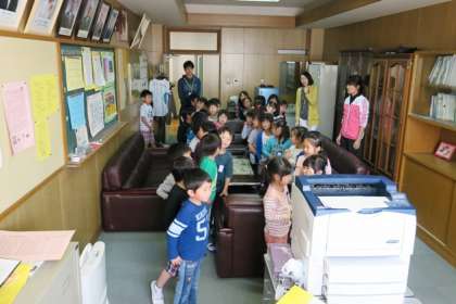 1年生が校舎の1階と2階にはどのような部屋があるのか探検しました。写真は、校長室に来た時の様子です。