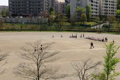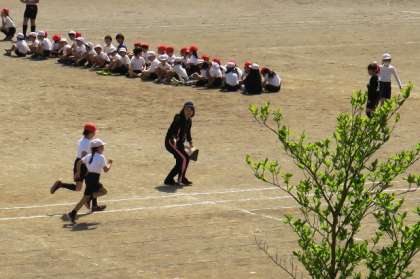 4年生が体育で短距離走の学習をしています。4年生は80m走ります。