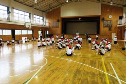 3年生が体育館で学年合同の体育を行いました。「エイサー」を踊る練習の第1回目でした。