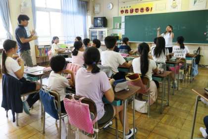 6年生が外国語活動で「I can〜」の表現について学習しました。歌を歌い、動作を加えながら、「Yes,I can.」「I can〜.」「No,I can't.」「I can't〜.」などの表現をしました。繰り返していくうちに、慣れていくのがよくわかりました。