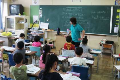 2年生が算数で「水のかさをはかろう」の学習をしています。今日は、1dLについて学習しました。書き方も丁寧に指導しました。