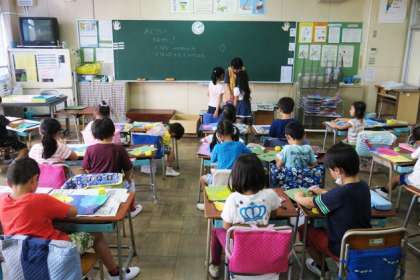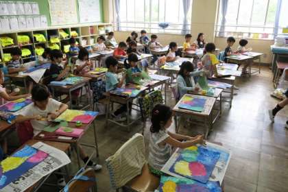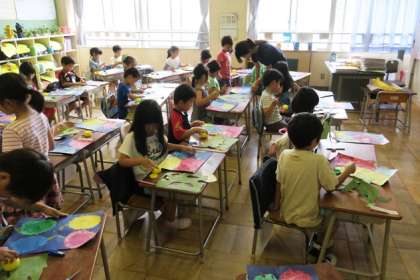 1年生が図画工作で、あじさいの絵を描いています。花の部分は、指に絵具をつけ、葉の部分は、紙を切り取ってはっています。