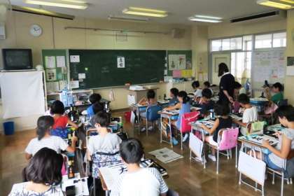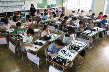 4年生が毛筆で「左右」を書きました。水泳の後でしたが、集中して書いていました。